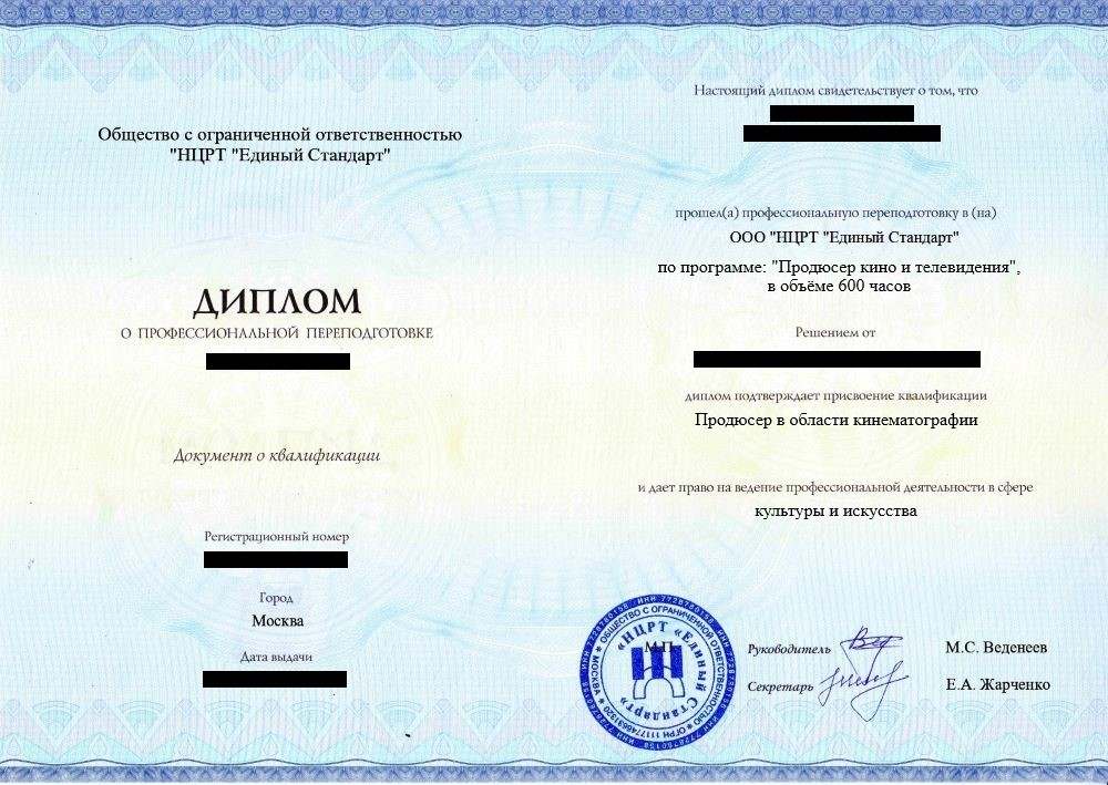 • «Продюсер в области кинематографии» с правом ведения профессиональной деятельности в сфере культуры и искусства