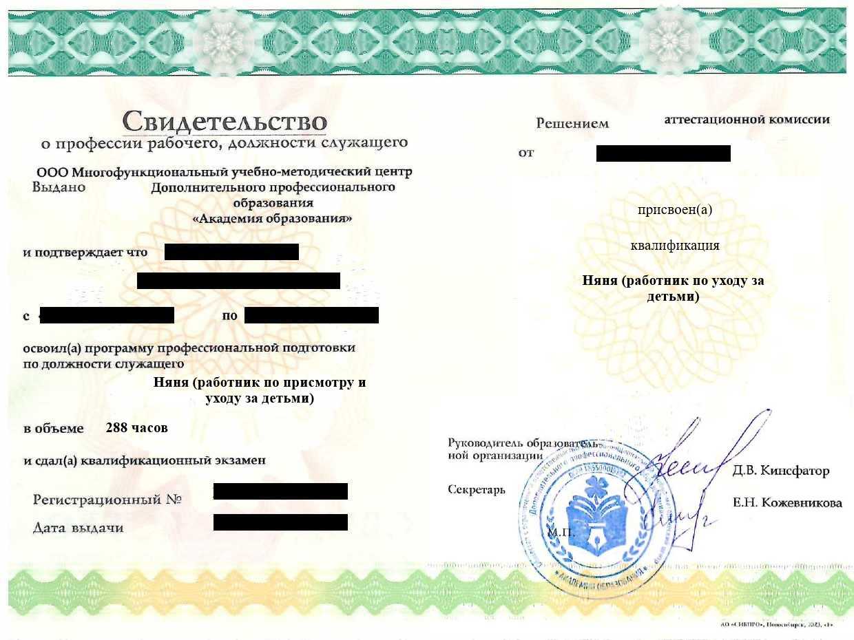- Свидетельство о профессии рабочего, должности служащего установленного государством образца. Срок действия: бессрочно